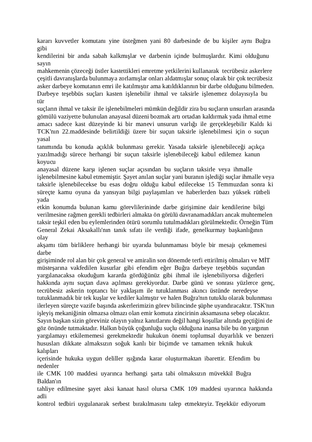 Yargılama sürecinin başlangıcında sunulan bu savunma, Buğra Baldan’ın olay gecesine dair en saf ve tutarlı anlatımını içerir. Dokümanda, bir kursiyer teğmen olarak emir-komuta hiyerarşisi içindeki konumu, kendisine verilen "terörle mücadele" dezenformasyonu ve iradesi dışında gelişen olaylar silsilesi hukuk diliyle aktarılmaktadır. Bu bölüm, suç kastının bulunmadığını ve askeri disiplin altındaki bir kursiyerin maruz kaldığı belirsizliği ortaya koyan temel dayanaktır.