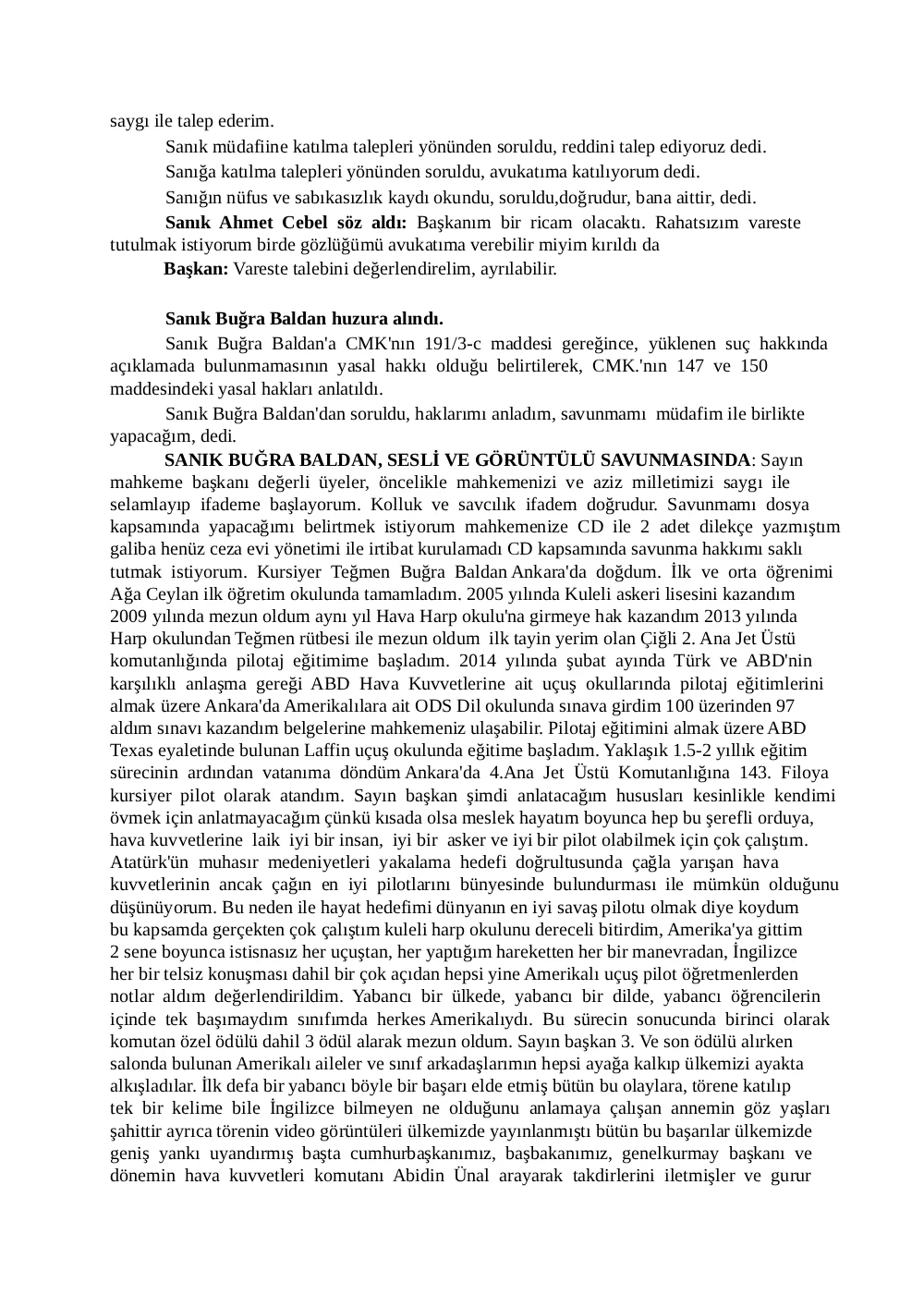 Tüm savunmaların ardından yapılan bu nihai beyan, hukuki argümanların ötesinde vicdani bir duruşu temsil eder. Buğra Baldan, son sözünde bir subay olarak ülkesine olan sadakatini vurgularken, adaletin sadece kendisi için değil, suçsuzluğu belgelerle sabit olan tüm kursiyerler için tecelli etmesi gerektiğini belirtmiştir. Doküman, hapishane koşullarında dahi kaybetmediği vakarın ve hukuk önünde aklanacağına olan sarsılmaz inancının bir özetidir.