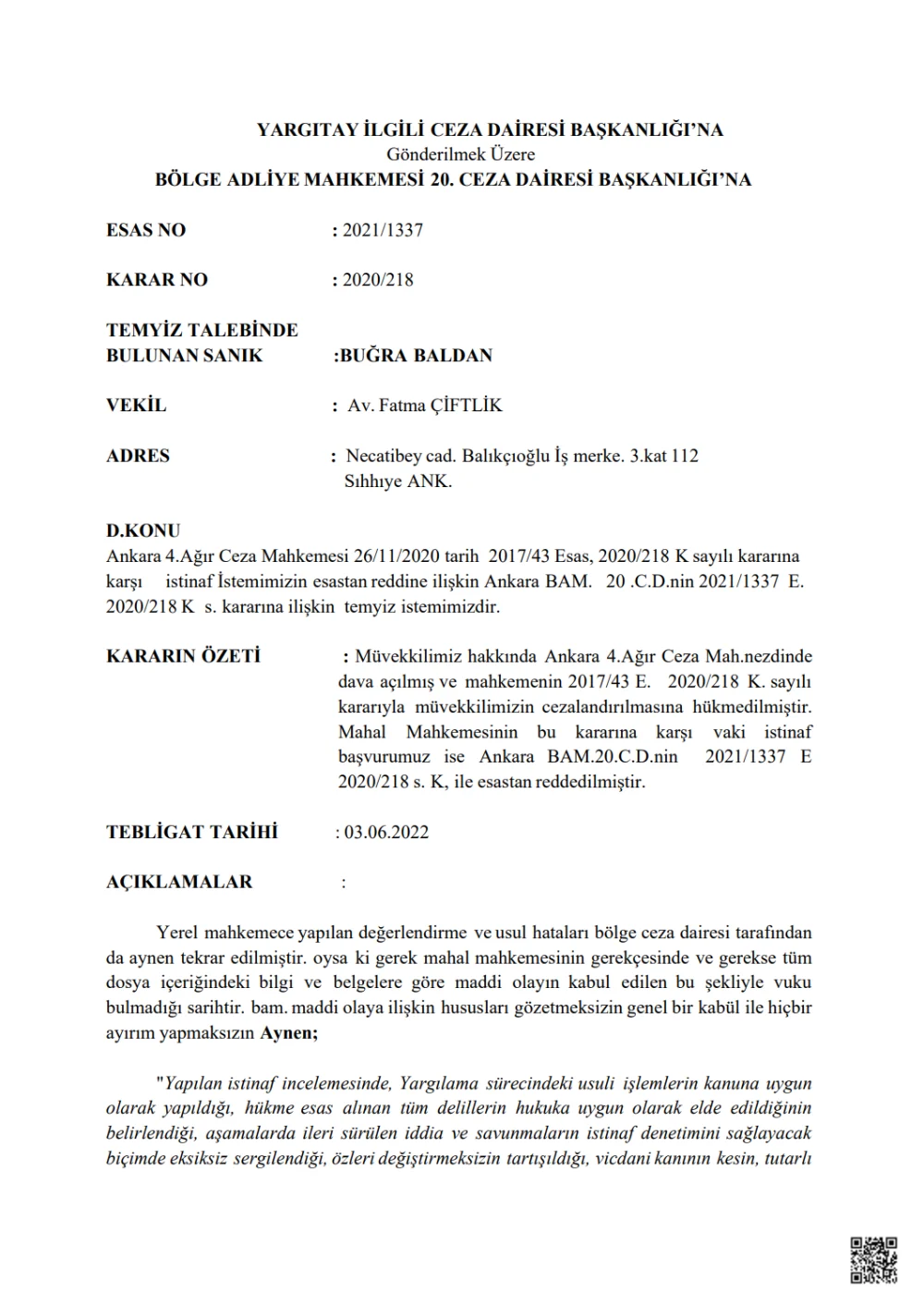 Yerel mahkemenin kararını üst yargıya taşıyan bu kapsamlı dilekçe, masumiyetin tescillenmesi yolundaki güncel hukuki adımı oluşturur. Dilekçede, Türk Ceza Kanunu’nun "hukuka aykırı fakat bağlayıcı emir" prensipleri ile kursiyerlerin statüsü arasındaki ilişki teknik ayrıntılarıyla irdelenmektedir. Bu doküman, alt rütbeli askerlerin ceza sorumluluğunun bulunmadığına dair Yargıtay içtihatlarını ve Avrupa İnsan Hakları Sözleşmesi normlarını temel alan nihai itirazları kapsamaktadır.